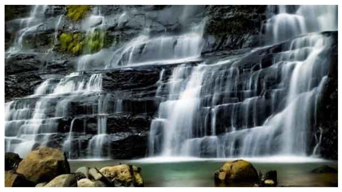 Aliran air yang jatuh dari ketinggian sekitar 40 meter membentuk tebing berundak yang sangat memukau.